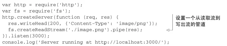 数据从文件中读进来( fs.createReadStream ),然后数据随着进来就被 送到( .pipe )客户端( res )。在数据流动时,事件轮询还能处理其他事件