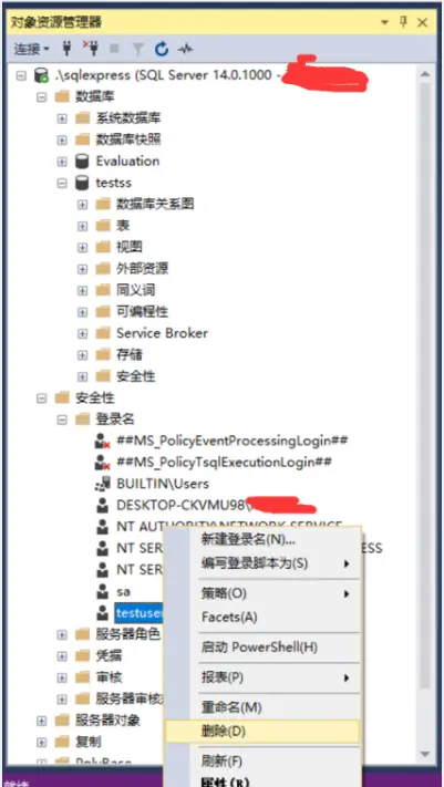不能删除正在登录的登录名。 也不能删除拥有任何安全对象、服务器级对象或 SQL Server 代理作业的登录名。
