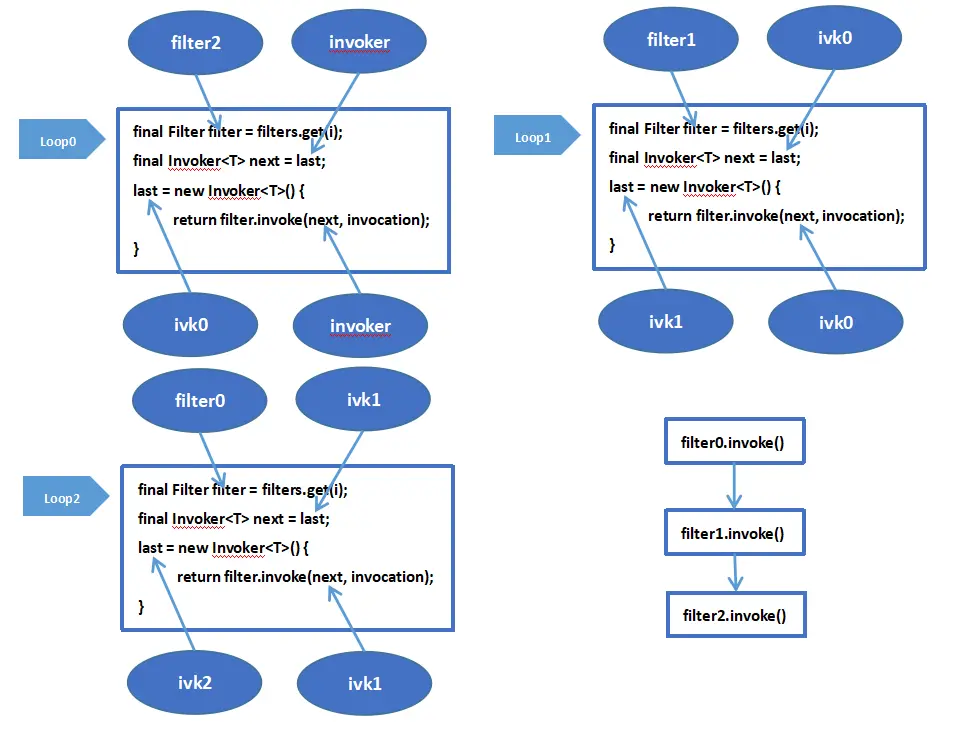 假设当前获取到的 filters 集合中保存的 filter 对象为 filter0、filter1、filter2。我们对 filters 集合进行倒序遍历。最后获得的 last 其实为新建的 ivk2 对象。如果我们调用 last 的 invoke 方法,调用链如下图所示:
