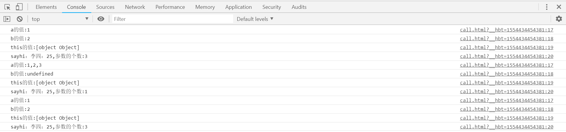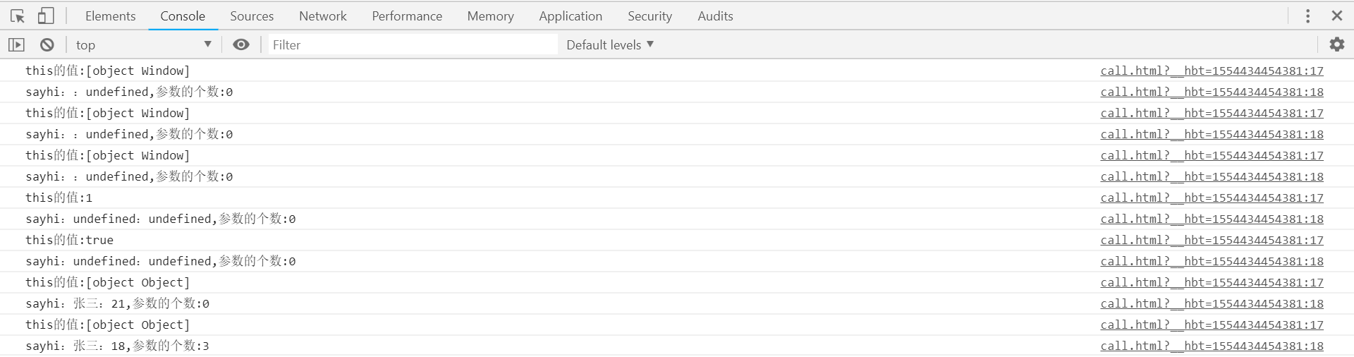 console.log("sayhi:" + this.name + ":" + this.age + ",参数的个数:" + arguments.length);