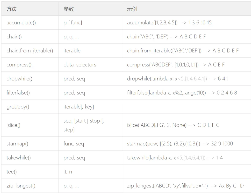 以上方法,比较常用的有:chain() 将多个可迭代对象(可以是不同类型)连接成一个大迭代器;compress() 方法根据真假过滤器筛选元素;groupby() 把迭代器中相邻的重复元素挑出来放在一起;islice() 方法返回迭代器切片(用法参见《Python进阶:迭代器与迭代器切片》);tee() 方法根据可迭代对象创建 n 个(默认2个)迭代器副本。