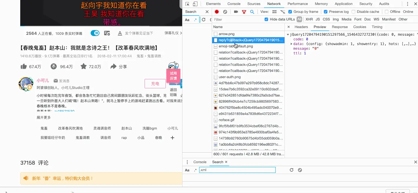 然后找到评论部分,打开谷歌浏览器的控制台,查看network选项的请求信息。通过观察我们发现了这样的链接:https://api.bilibili.com/x/v2/reply?callback=jQuery17204794190151297566_1546432727230&jsonp=jsonp&pn=1&type=1&oid=19390801&sort=0&_=1546432740370