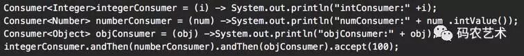 该方法表明Consumer 函数链消费相同的入参,后续函数的入参类型为前序函数入参的父类,即函数链越往后,入参类型越抽象。例如: