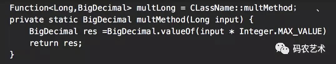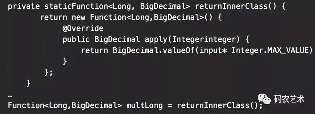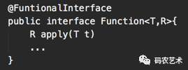 FuntionalInterface注解表明其是一个函数接口,事实上任意一个接口如果只有一个抽象方法,都可作为函数接口使用,不过覆盖Object类的public方法的接口除外。函数R apply(T t) 方法表明Function 接收一个T 类型的入参,返回一个R 类型的对象。可以通过以下方式声明一个Function实例: