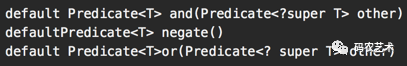 Predicate接口代表逻辑判断函数。抽象方法boolean test(Tt)说明根据入参t,判断其是否满足一定的逻辑条件,返回bool结果。三个default 方法: