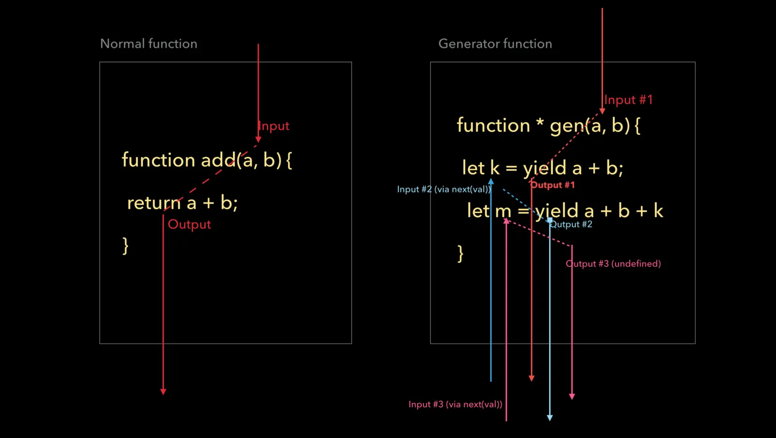 Generators(生成器) —— 为 Iterables 提供更高阶抽象方法。他们还提供新的控制流程,可以解决像回调地狱这样的问题并为像Async/Await这样的事情提供构建块。