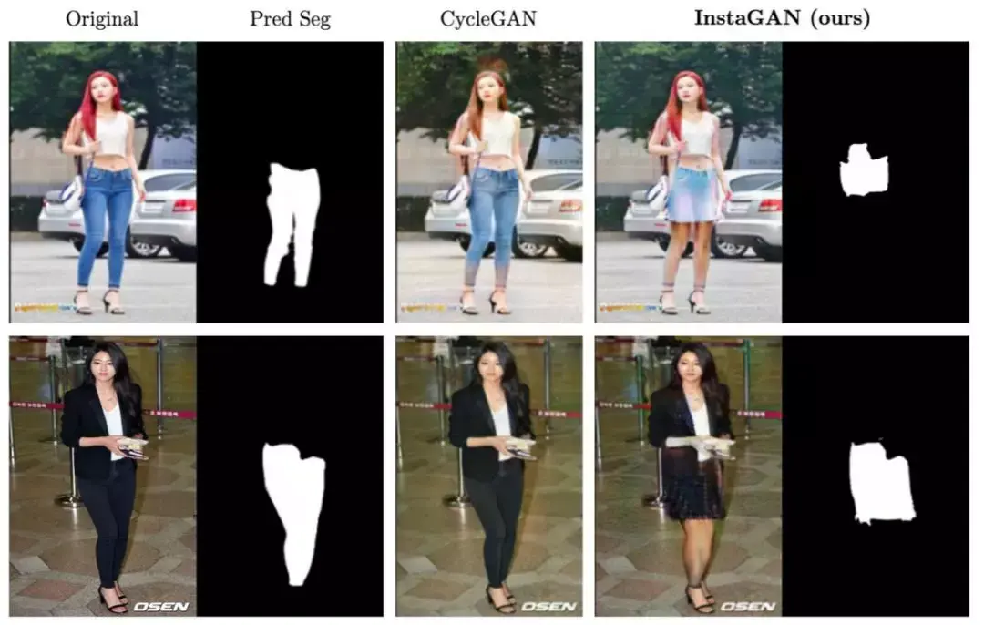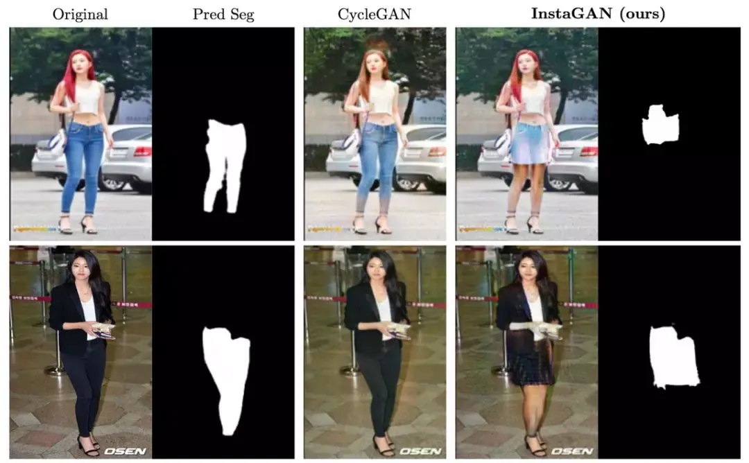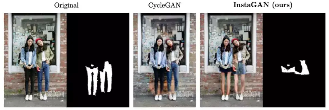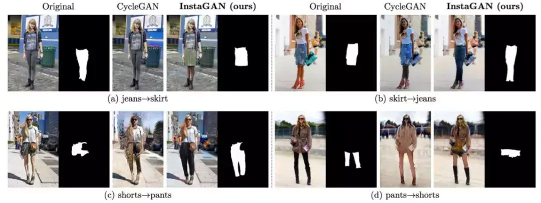InstaGAN 成功地把牛仔裤和短裙互换,把短裤和长裤互换。