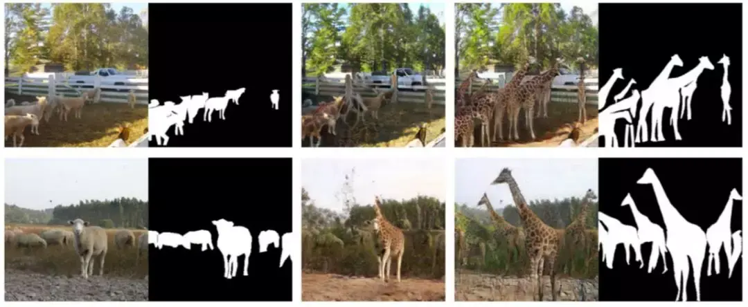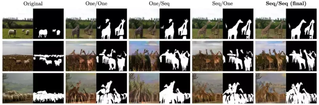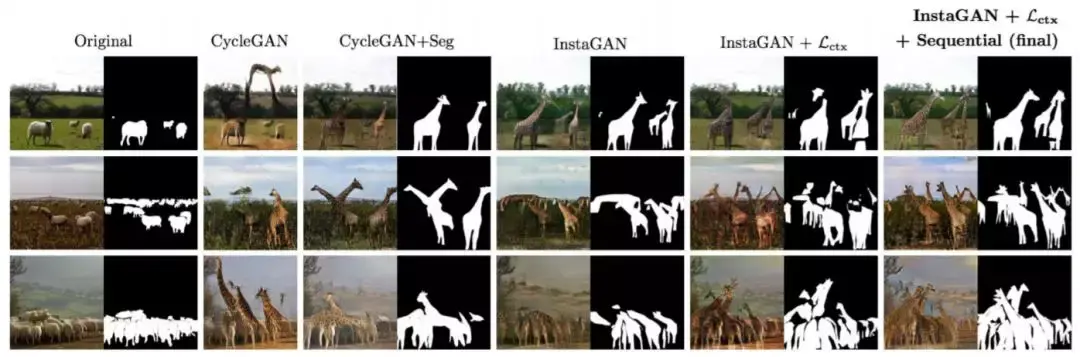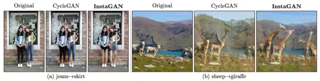 新奇的是,InstaGAN 转换了一幅图像和一组相应的实例属性,并同时力求保留背景语境。当与一种创新的技术(该技术允许其在传统硬件上处理大量实例属性)结合时,它可以推广到具有许多实例的图像。如下图所示,把两个人的牛仔裤换成裙子,把四只绵羊换成长颈鹿都不是问题。