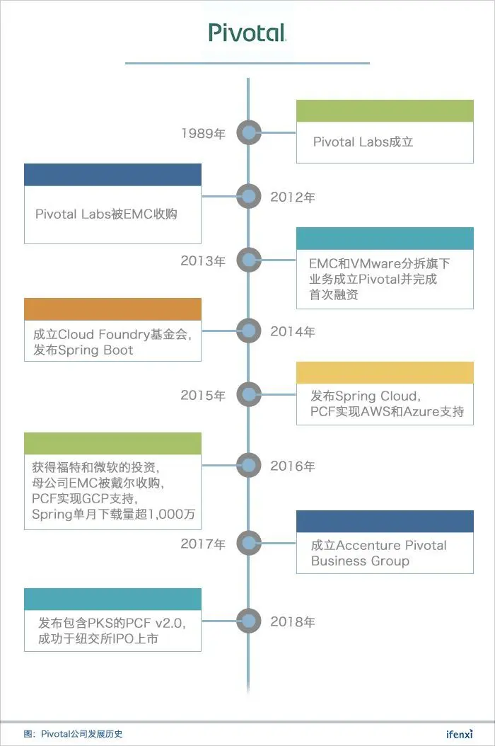 Pivotal 公司成立之后,于 2014 年发布了 Spring Boot,2015 年发布了 Spring Cloud,2018 年 Pivotal 公司在纽约上市。我们可以通过一张图来了解 Pivotal 公司的发展史。