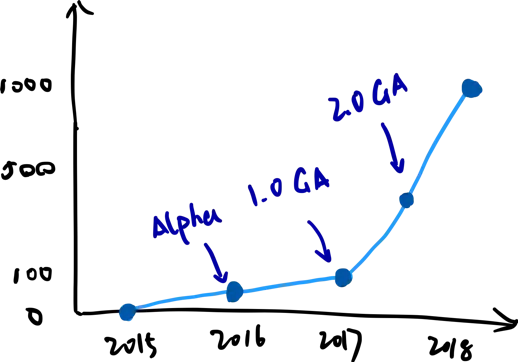 在使用场景上,TiDB 的使用规模也越来越大,下面这张图是我们统计的我们已知 TiDB 的用户,包括上线和准上线的用户,从 1.0 GA 后,几乎是以一个指数函数的曲线在增长,应用的场景也从简单的 MySQL Sharding 替代方案变成横跨 OLTP 到实时数据中台的通用数据平台组件。