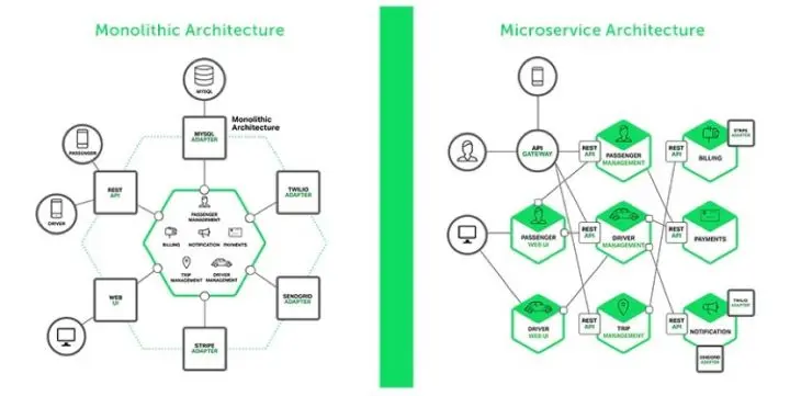 单体架构 VS 微服务架构,图片来自互联网