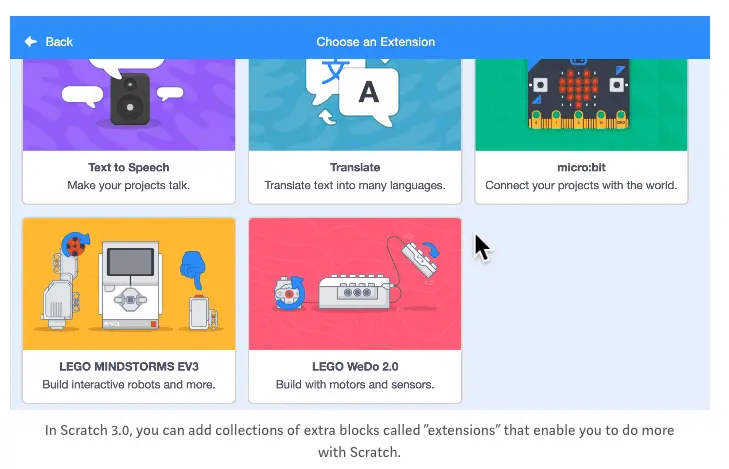 使用Scratch扩展,您可以向Scratch添加新的代码块。 使用LEGO®EducationWeDo 2.0,LEGO®MINDSTORMS®EducationEV3和micro:bit扩展程序对电机,灯和传感器进行编程。 使用Google翻译扩展程序对其他语言的角色进行编程,或者使用Amazon的文字转语音扩展来大声说话。 您甚至可以使用网络摄像头和视频传感扩展程序对角色进行编程以响应您的身体动作。此扩展库将持续更新,扩展您可以使用Scratch创建的内容。