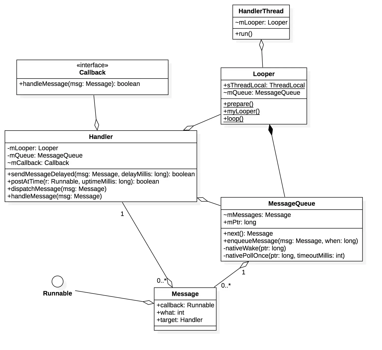 MesssageQueue类中维护一个消息队列(由链表实现),MessageQueue不仅组合在Looper中,也聚合在Handler中。它向Handler提供了把消息入队列的接口,向Looper提供了把消息从队列取出的接口。