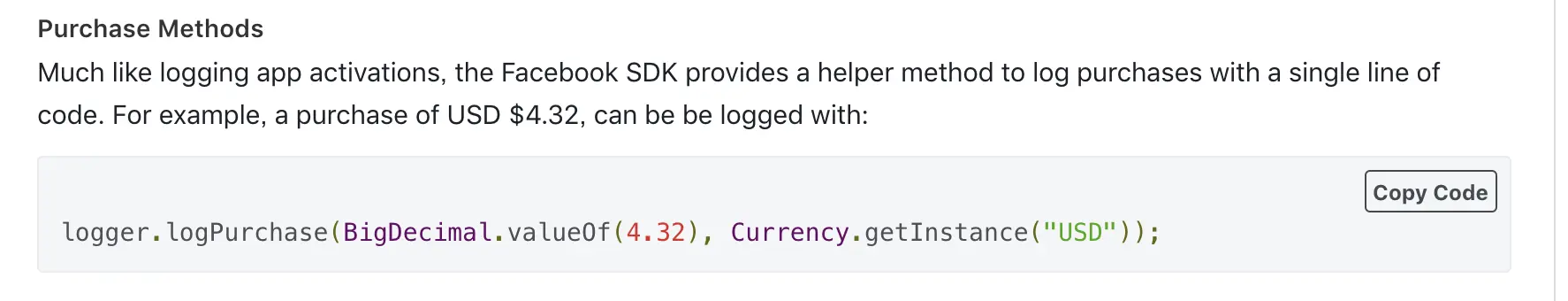 logger.logPurchase(BigDecimal.valueOf(4.32), Currency.getInstance("USD"));