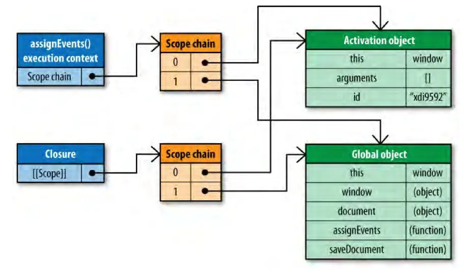 assignEvents 函数为DOM元素分配一个事件处理程序。这个处理函数就是一个闭包。为了使该闭包访问id变量,必须创建一个特定的作用域链。