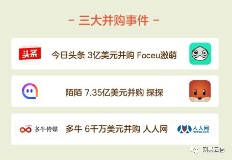 除上述融资事件之外,并购事件也折射了社交领域的方向标。除去陌陌7.35亿美元并购探探整合陌生人社交之外,今日头条3亿美元并购Faceu激萌与多牛6000万美元并购人人网也映射着社交正逐步向泛娱乐市场拓展。