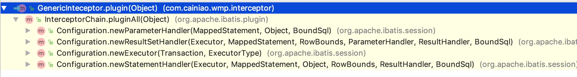 org.apache.ibatis.plugin.Interceptor#plugin是在org.apache.ibatis.plugin.InterceptorChain#pluginAll方法中调用的,我们可以看到,如果一个应用中注册了多个拦截器,那么实际上是会进行一个for循环的加载,由于上面说到了,加载一次,本质上是对mybatis的执行期进行一次代理包装,那么加载多次的话,就会代理包装多次,实际上就是一种多重代理了,这样就保证了每次调用都会按照代理顺序进行调用和返回的处理