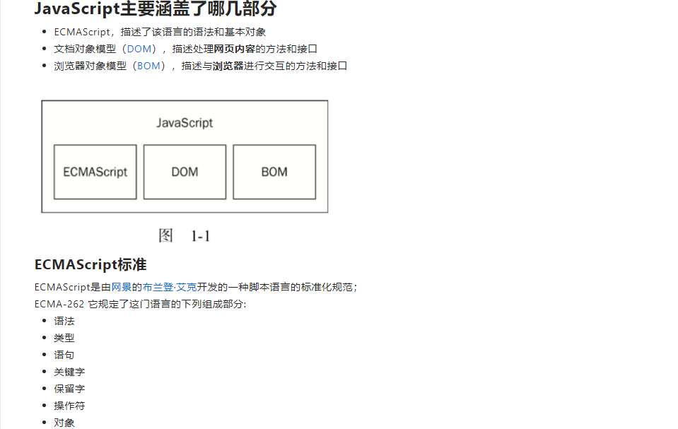- ECMAScript(ES):规定了JS的一些基础核心的知识(变量、数量类型、语法规范、操作语言等)