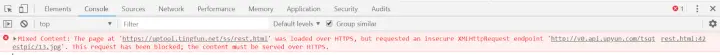 调试工具正常,但是代码嵌入网页上传时候控制台报错。这是因为网站用的是 HTTPS 协议,但是请求的是 HTTP 协议的接口,浏览器是拒绝在 HTTPS 的网站内请求 HTTP 协议的地址的,所以把请求地址更改为:https://v0.api.upyun.com/ 即可。