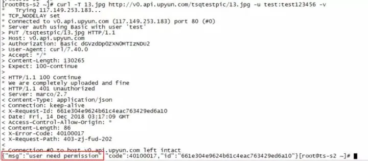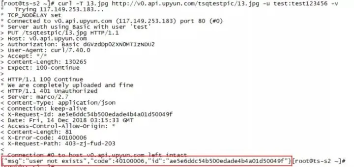 上面是用 PUT 方法来上传文件,但是返回状态码 401,通过返回的 body 我们可以看出提示是比较清晰的:user not exists。这种情况一般是没有创建操作员或者创建了操作员但是没有授权给对应的服务。操作员这个概念会出现在云存储 API,云处理 API 和人工智能 API 中,所以这是个常见的 401 错误。