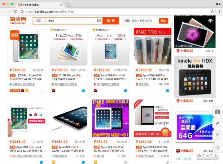抓取入口就是淘宝的搜索页面,这个链接可以通过直接构造参数访问。例如,如果搜索iPad,就可以直接访问s.taobao.com/search?q=iP…。