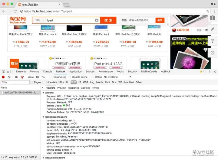 打开淘宝页面,搜索商品,比如iPad,此时打开开发者工具,截获Ajax请求,我们可以发现获取商品列表的接口,如图所示。