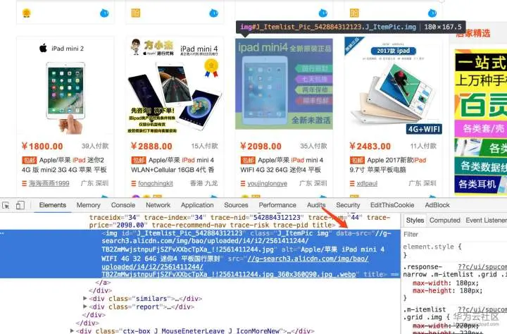 可以发现,它是一个img节点,包含id、class、data-src、alt和src等属性。这里之所以可以看到这张图片,是因为它的src属性被赋值为图片的URL。把它的src属性提取出来,就可以获取商品的图片了。不过我们还注意data-src属性,它的内容也是图片的URL,观察后发现此URL是图片的完整大图,而src是压缩后的小图,所以这里抓取data-src属性来作为商品的图片。