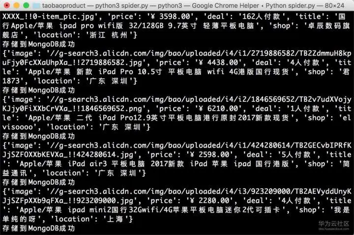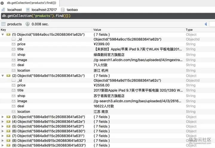 可以发现,这些商品信息的结果都是字典形式,它们被存储到MongoDB里面。