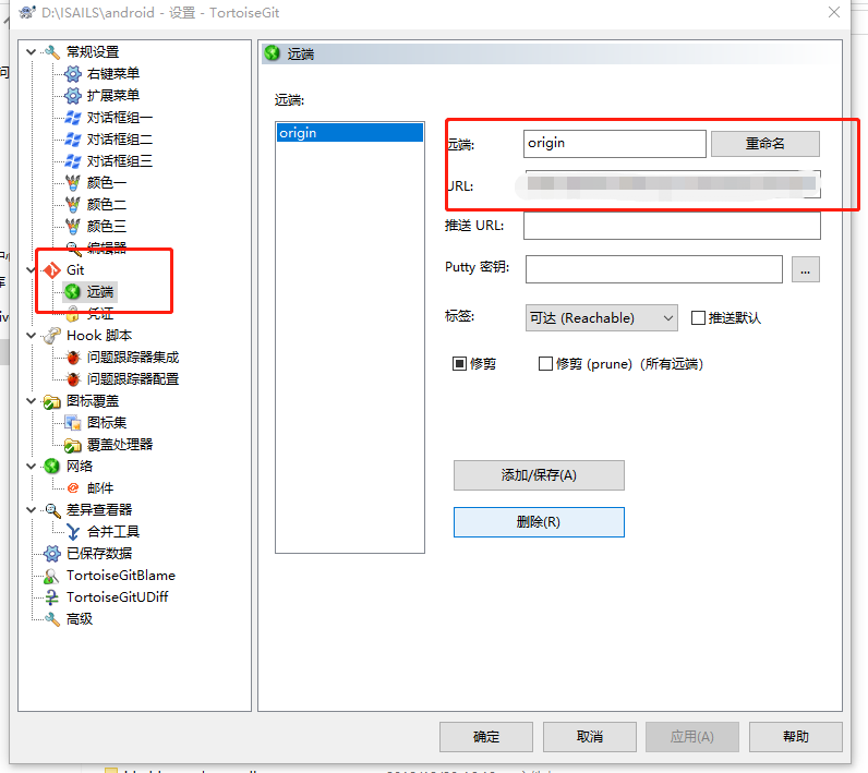 AndroidStudio Git 更改gitlab 地址 亮亮1491880748512 2019-01-03 1,822 阅读1分钟 gitlab 地址更新可用方式小结: idea: gitlab 地址更新,需要 更新一个url 地址,需要知道这个地址的位置 修改 即可,而这个地址 可以通过两种方式打开 进入项目根目录,TortoiseGit 中---远端--origin 更新起 URL 地址--应用--确定。 进入项目的 .git 文件夹,找到 config 文件,修改 文件中 URL 的地址,保存即可