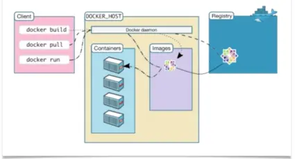 从这张图可以看出,Docker的架构是非常简答的。中间是Host,上面装了一个Docker daemon的守护进程,守护进程应用做很多docker的操作,那么谁让 docker daemon来做这些操作呢,是最左边client,比如我们再终端操作输入dokcer的命令,客户端讲命令发送给docker守护进程,让docker去做一些操作,比如从最右边的镜像仓库拉取镜像到宿主机上,然后在宿主机上跑镜像,运行容器。