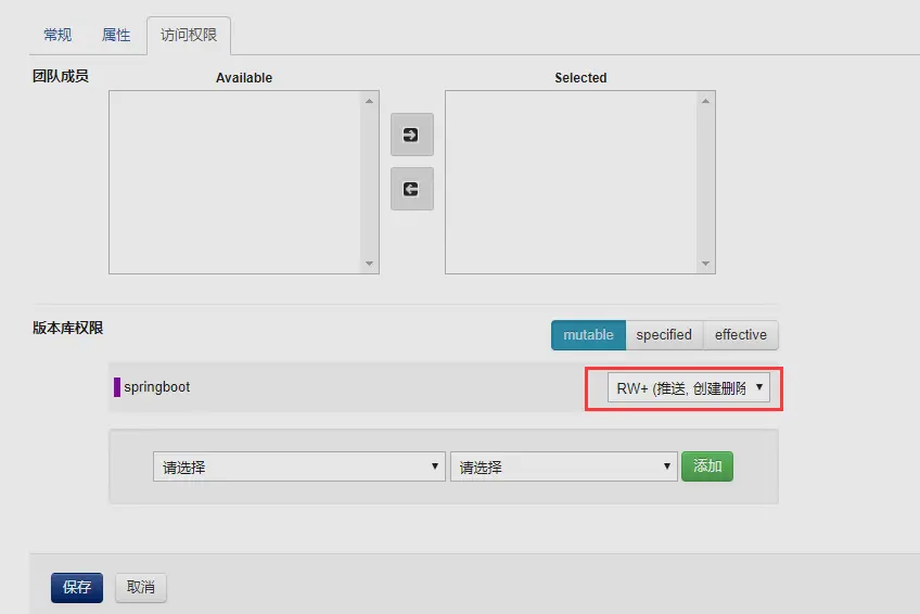 访问权限页填写,配置版本库权限。选择版本库,选择logit.git 赋予具体权限,R(克隆)一般赋予测试人选,RW(推送)、RWC(推送,创建ref)、RWD(推送,创建删除ref)、RW+一般赋予开发人员,选好之后,按添加按钮最后,选择保存,创建成功。