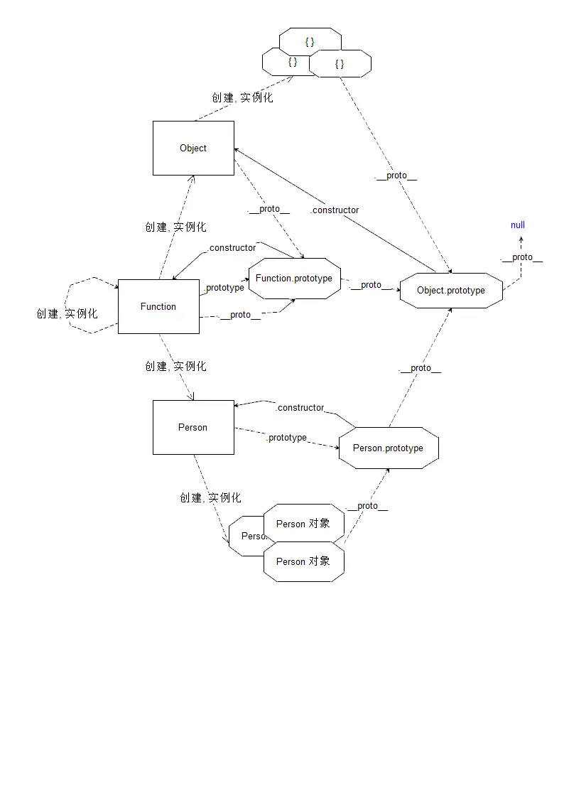 __proto__这条线来找,如果B的prototype在这条线上,那么返回true,否则返回falsefunction Foo(){} var f1 = new Foo(); console.log(f1 instanceof Foo); // true console.log(f1 instanceof Object); // true 分析方法: f1的__proto__路线A: (1) f1.__proto__ === Foo.prototype (2) Foo.prototype.__proto__ === Object.prototype (3) Object.prototype.__proto__ === null //到终点Object函数也是Fucntion创建出来的,而且Fucntion是被自身创建的