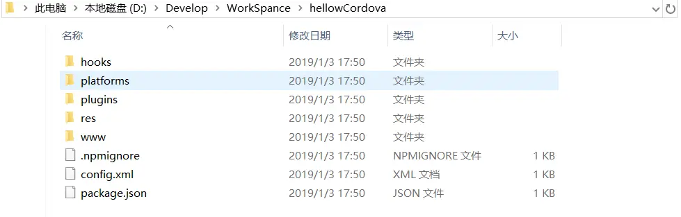 其实这个时候你看看文件结构,你会发现platforms文件夹下面什么都没有!!!然后进入到 hellowCordova 文件夹下,添加android平台的配置。