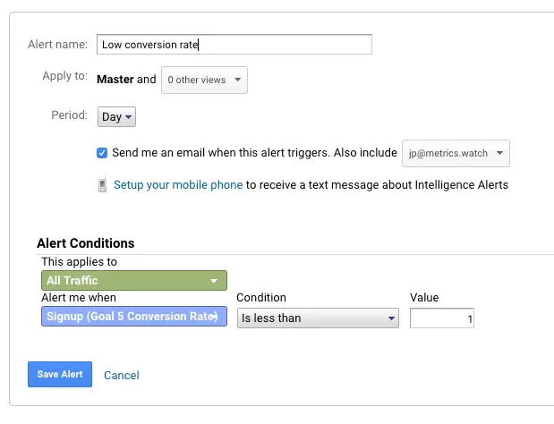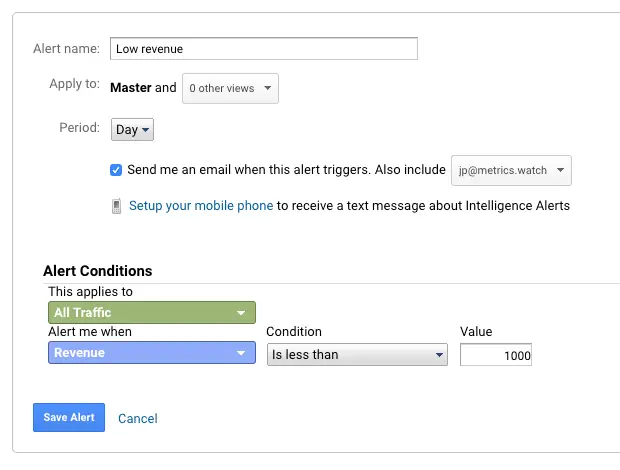Another, more flexible option to set up Google Analytics alerts