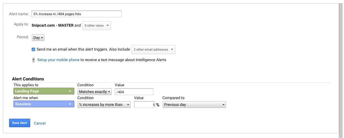 But what about 404’s? You should create a Google Analytics alert for that too. You should set alert thresholds so you know ASAP when you get an issue and can start fixing it right away.