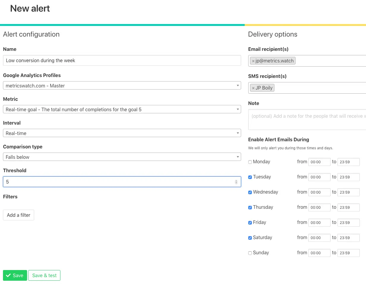 You can then push your alert system further with a few important details: email recipients, SMS recipients, and the chosen days (and specific hours) the alert is enabled.