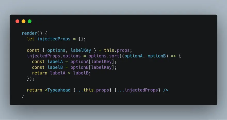 This way, the options in injectedProps will overwrite the original options in props. That's how we can sort all options by alphabetic order by default.