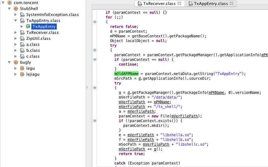 其实这时候我们发现,破解原dex的工作变成了破解壳dex了,最终的原理是一样的,早期的梆梆、360等公司的加固方案都被人破解,网上能查到破解步骤。当然他们的加固方案升级很快,网上看的破解方案对于新的加固方案基本已经无效。我们使用腾讯的乐固加密一个不包含so库的APK后反编译后可以看到如下:
