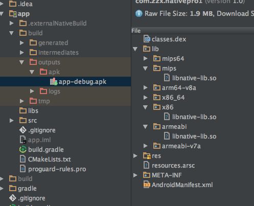 我们编译出apk并反编译这个程序如下图,会发现包里面多了一堆libnative-lib.so(其实只是一个库,为了支持不同的CPU架构编程出了多个版本)。
