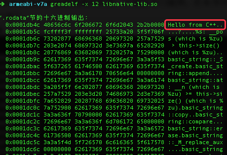 我们发现了之前辛苦藏到so中的字符串"Hello from C++"。如果想看代码实现,可以使用objdump命令,能看到反汇编后的代码。