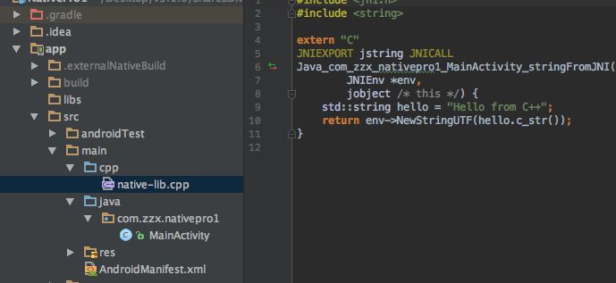 这时会创建一个支持NDK的默认工程,项目里包含从C++代码中获取一个字符串的demo: