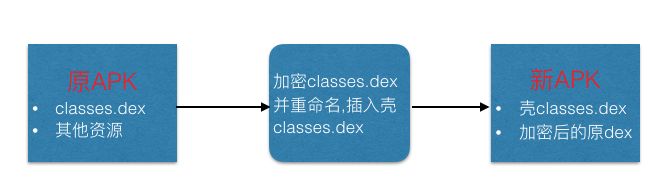 我们知道一个常规Android程序它的所有代码都在dex文件中,程序启动时要先把这个dex文件载入到内存中,所以如果要加壳的话,主要工作就是把原dex文件加密或者隐藏起来,放一个新的壳dex到apk中,程序启动时运行这个壳dex,然后这个壳dex在运行时再加载原dex,用一张图表示如下: