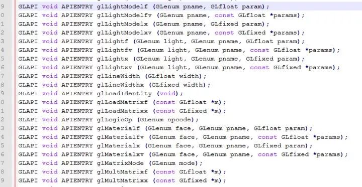 是用固定管线并不意味着你不需要写代码了,只不过你编写程序的创造力受到的很大限制。 OpenGL 4.0 前是支持固定管线的,在以往的旧代码中,OpenGL 的 API 是这个样子。
