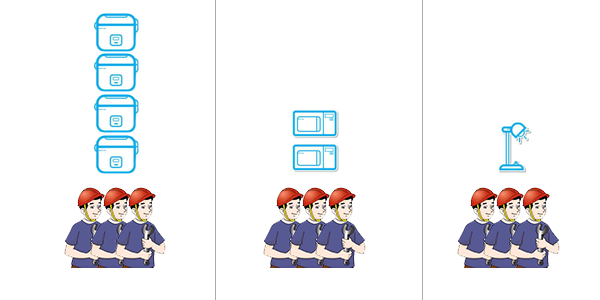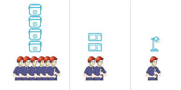 打个比方说,你是一个老板。手下有 100 名工人。工厂有 3 种工作。“制作电饭煲” 、“制作微波炉” 、“制作台灯” ,这 3 种工作都有对应的厂区,因为无法预测未来工作每一种产品的订单量,所以你只能预先分配这些工人,一旦订单种类不均衡,便会出现有些厂区忙的要死,有些却被闲置的现象。