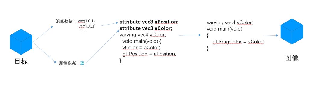 值得注意的是如果在 顶点着色器 与 片元着色器 中存在同名的 varying 变量,则其值可以由顶点着色器传递与片元着色器,如上例中都存在名为 vColor 的 varying 变量,执行 vColor=aColor 后在片元着色器中便可以取到 vColor 的值。