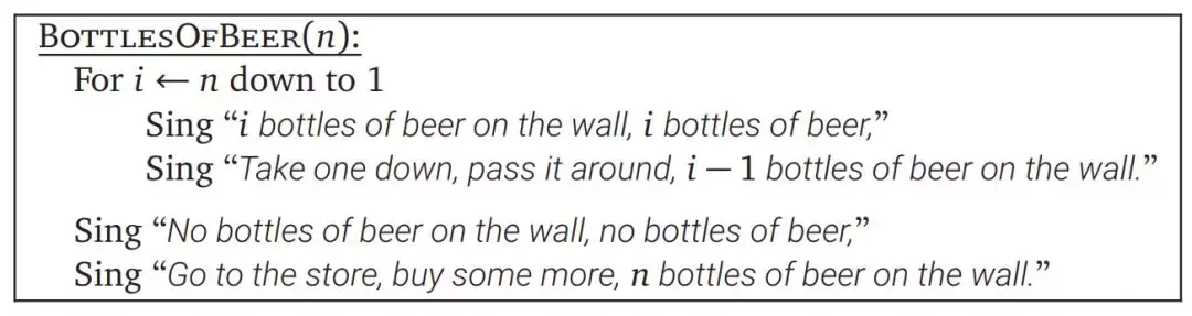 例如下面的伪码定义了一种「算法」来唱「99 Bottles of Beer on the Wall」,我们只要将 n 设置为 99 就完全和原版一样了。这就是一组精准和无歧义的指令元素:从 n 到 1 每次赋值一个整数为 i,并将 i 带入歌词且唱出,最后结尾再唱两句就行了。
