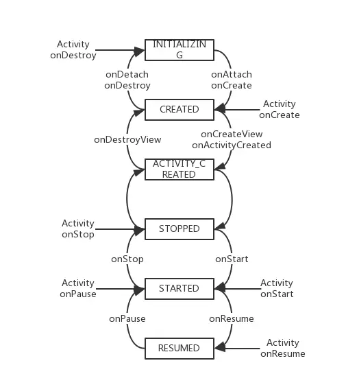 Fragment的整个生命周期一直在这6个状态中流转,调用对应的生命周期方法然后进入下一个状态,如下图