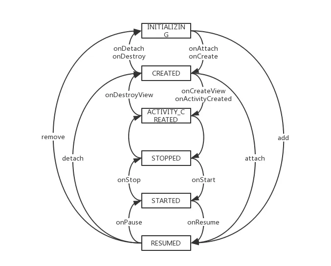 通过对Fragment生命周期的变化的观察,我们可以很容易发现,add/remove操作会引起Fragment在INITIALIZING和RESUMED这两个状态之间迁移。