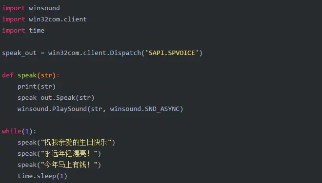 昨天女友生日,因为她一直对生日无感,所以我也就没有准备什么礼物。想起元旦前写的自动测试的脚本,添加了语音来提示测试和报告错误。灵机一动,为什么不用这个语音来庆祝她生日快乐呢?身为设计公司市场经理的她对程序又是完全无知, 说不定她会觉得有意思。于是就有了以下的代码: