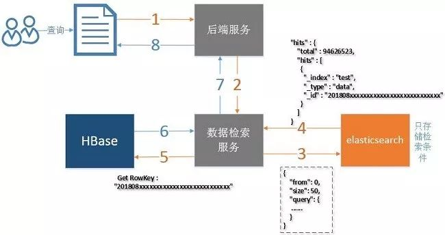 ES仅提供字段的检索,仅存储HBase的Rowkey不存储实际数据;